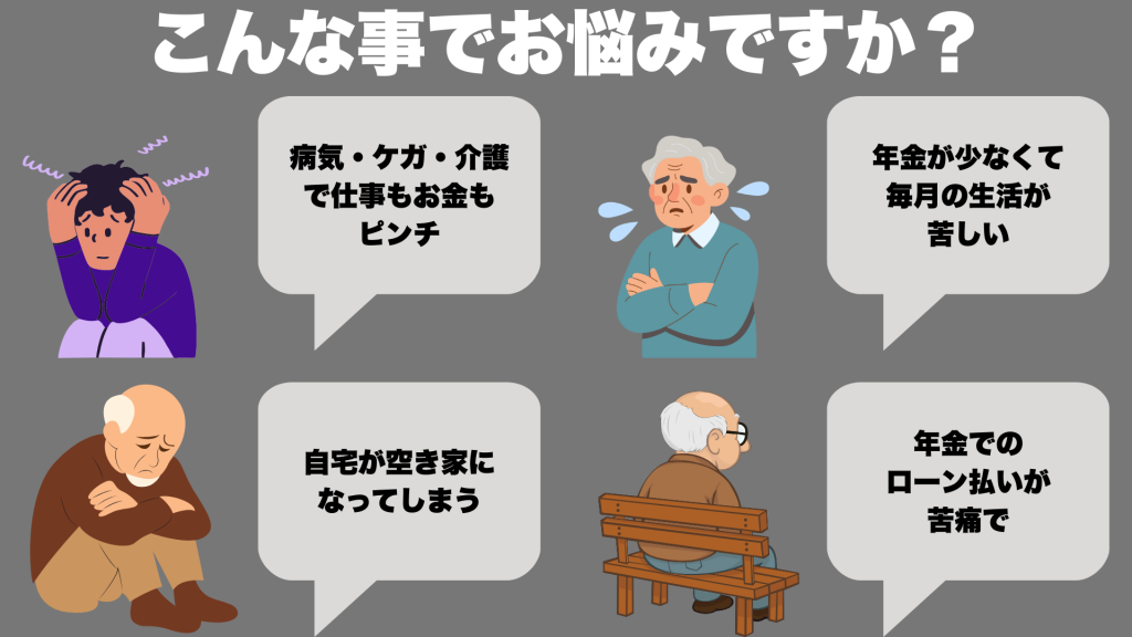 住宅ローンの返済が難しくなった方、競売を申し立てられた方、老後資金にゆとりを持たせたい方、自宅を現金化したい方など、さまざまなニーズに応えることができます。